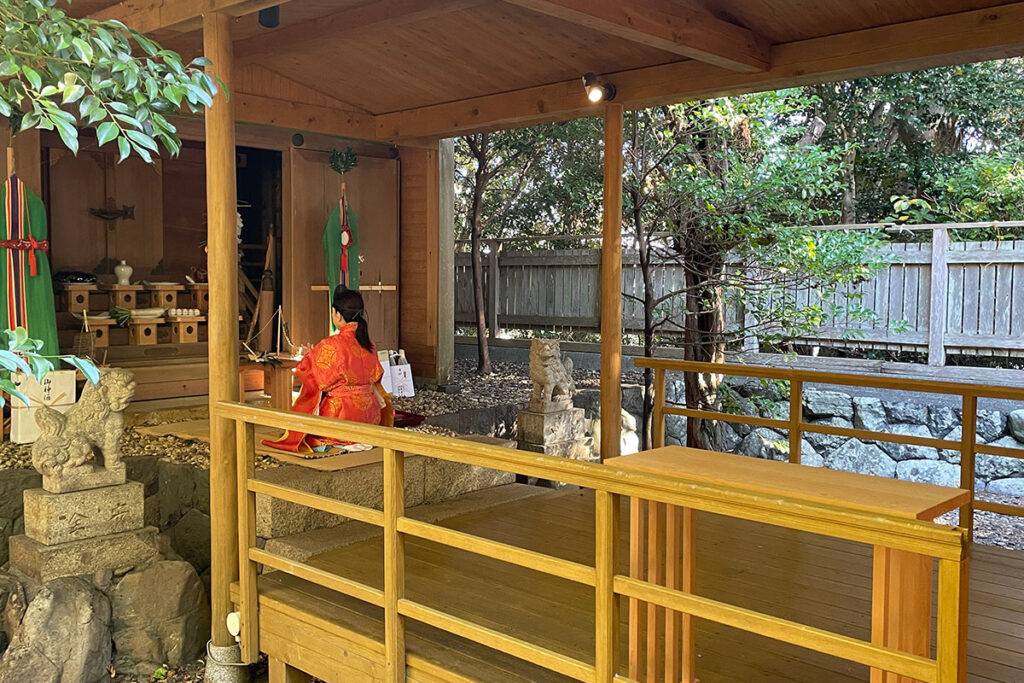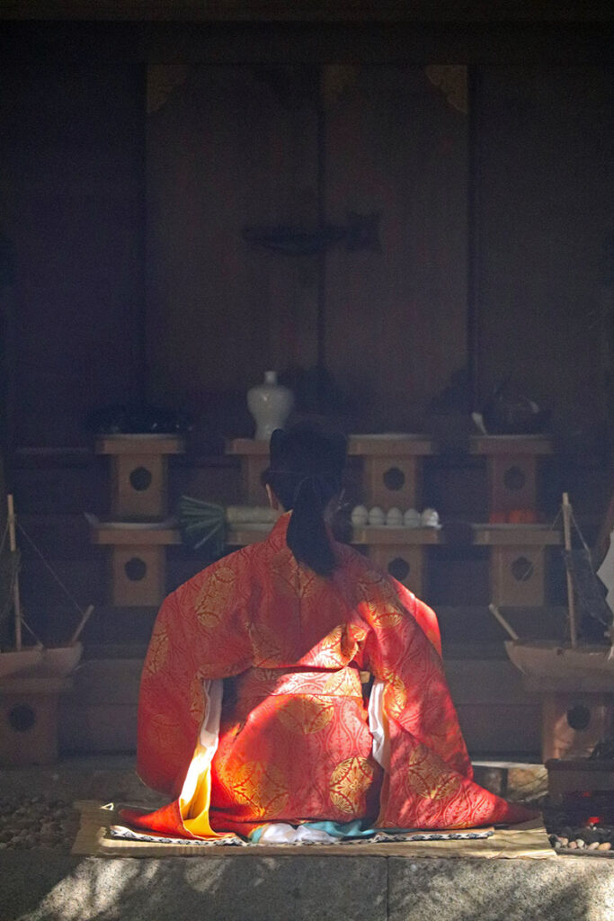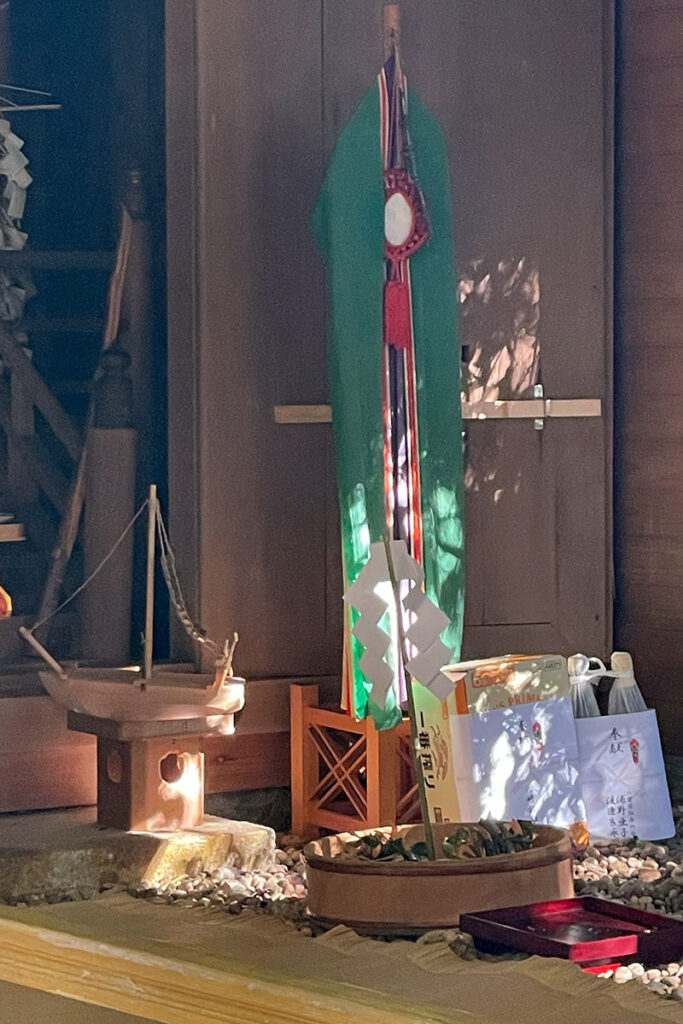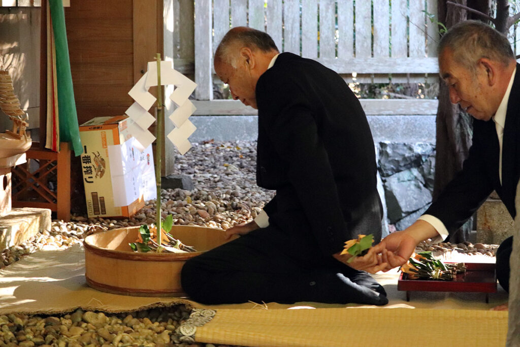 11月21日万度迎え(伊勢神宮よりお札を受ける)22日・殿入祭(神に供える小舟、オオフネ シゲ作り )が行われ、23日に海士潜女神社で二舟祭りの祭典が行われました。