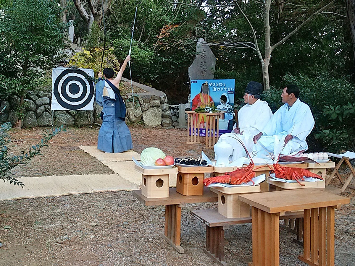 的には命中させない弓引き神事が行われます。その年の豊漁を占います。(海士潜女神社にて)。